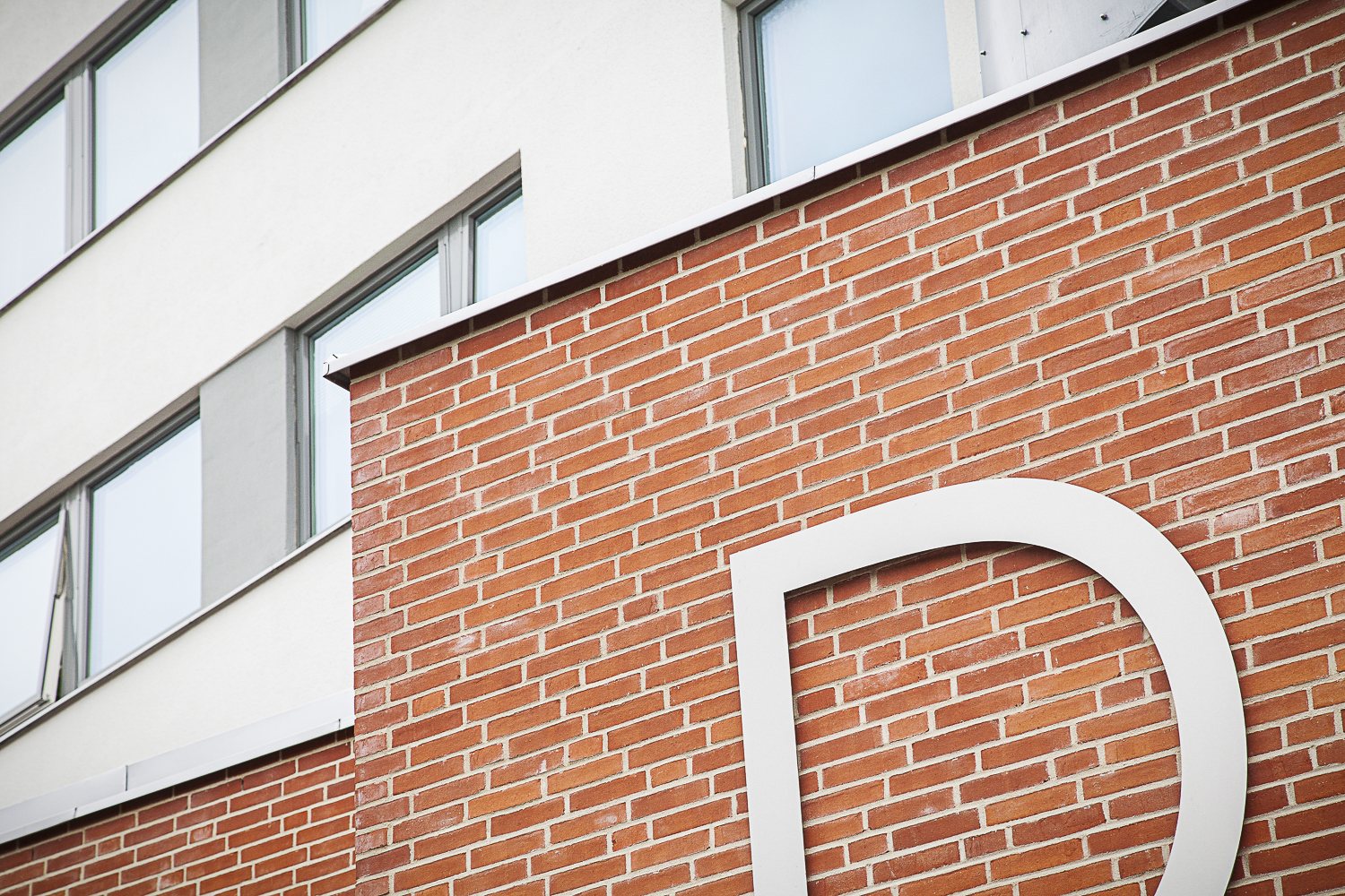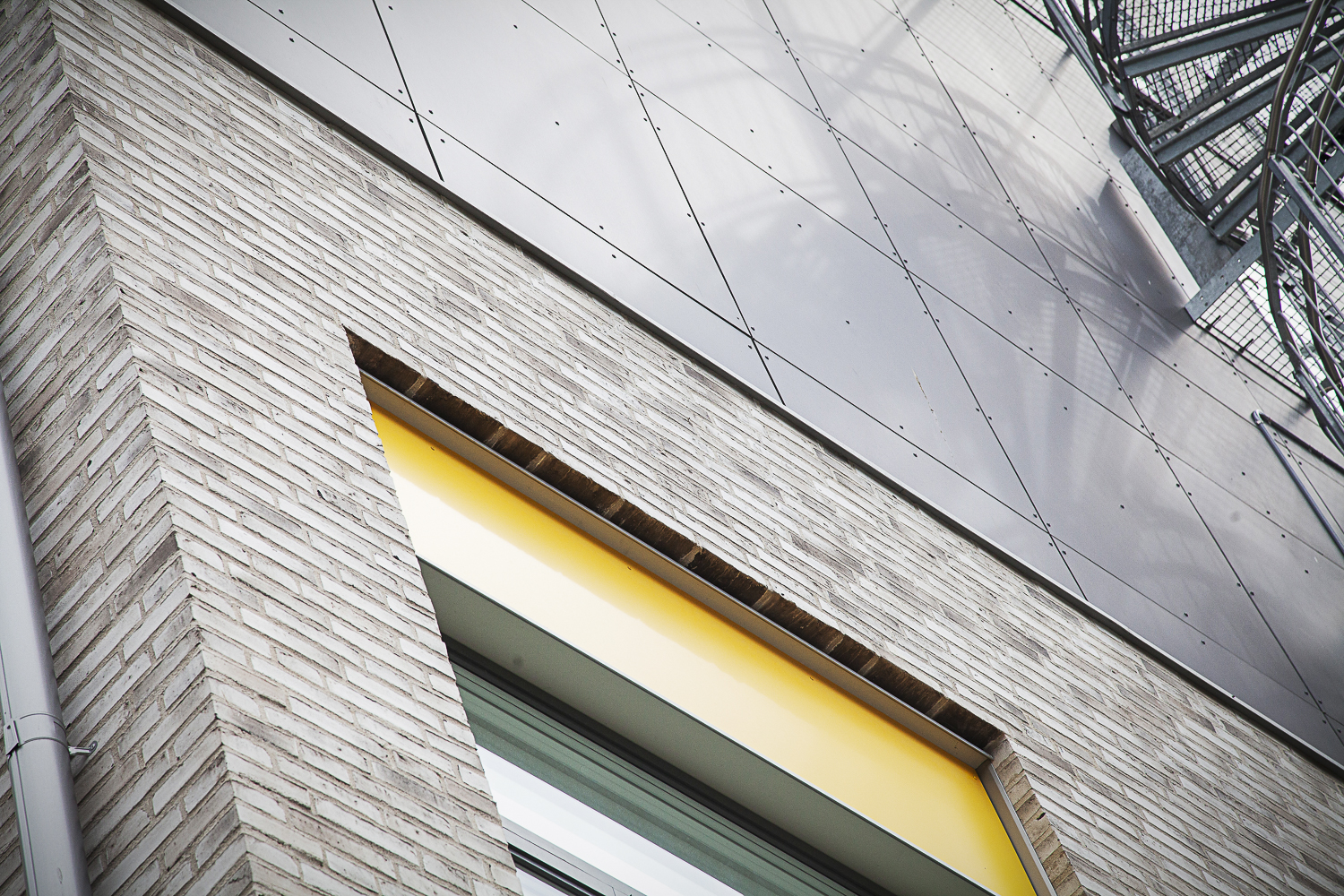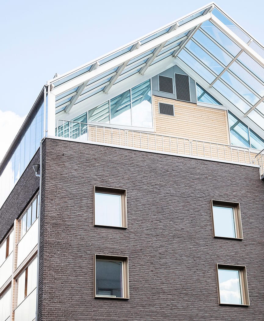 Förutsättningarna för projektet var en väldigt långsmal och utmanande tomt. Av den anledningen har byggnaden delats upp i fem huvudvolymer. Tre helt i tegel och två mellanliggande volymer i skärmtegel. Skärmteglet är återkommande i tegelvolymernas fönsterband.