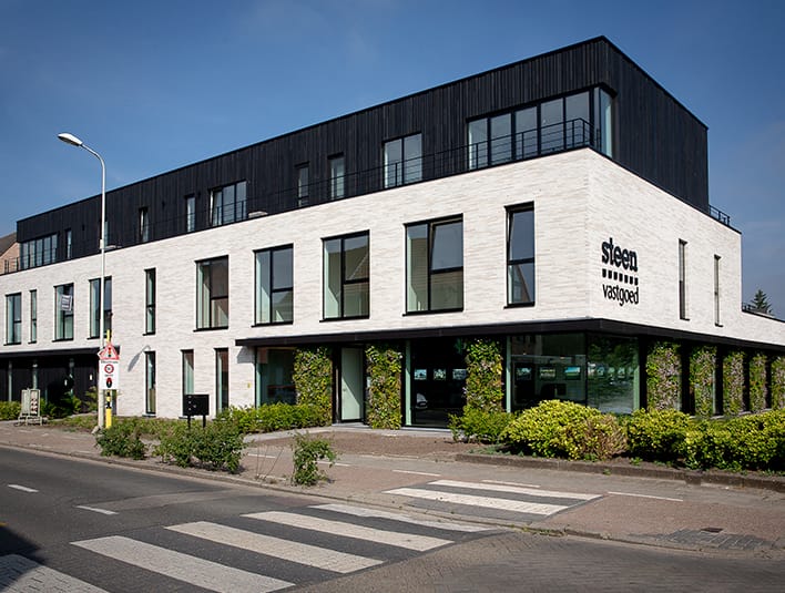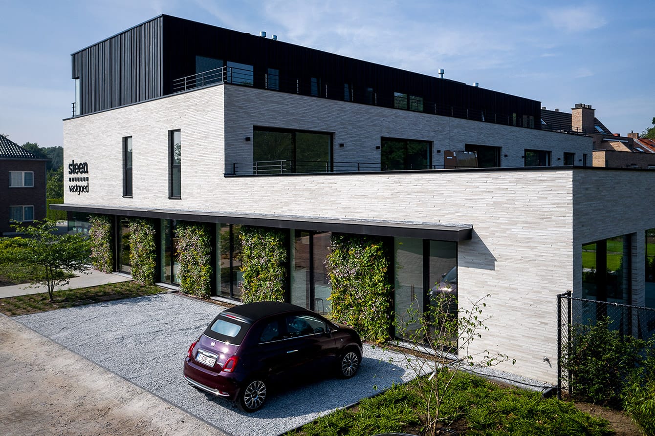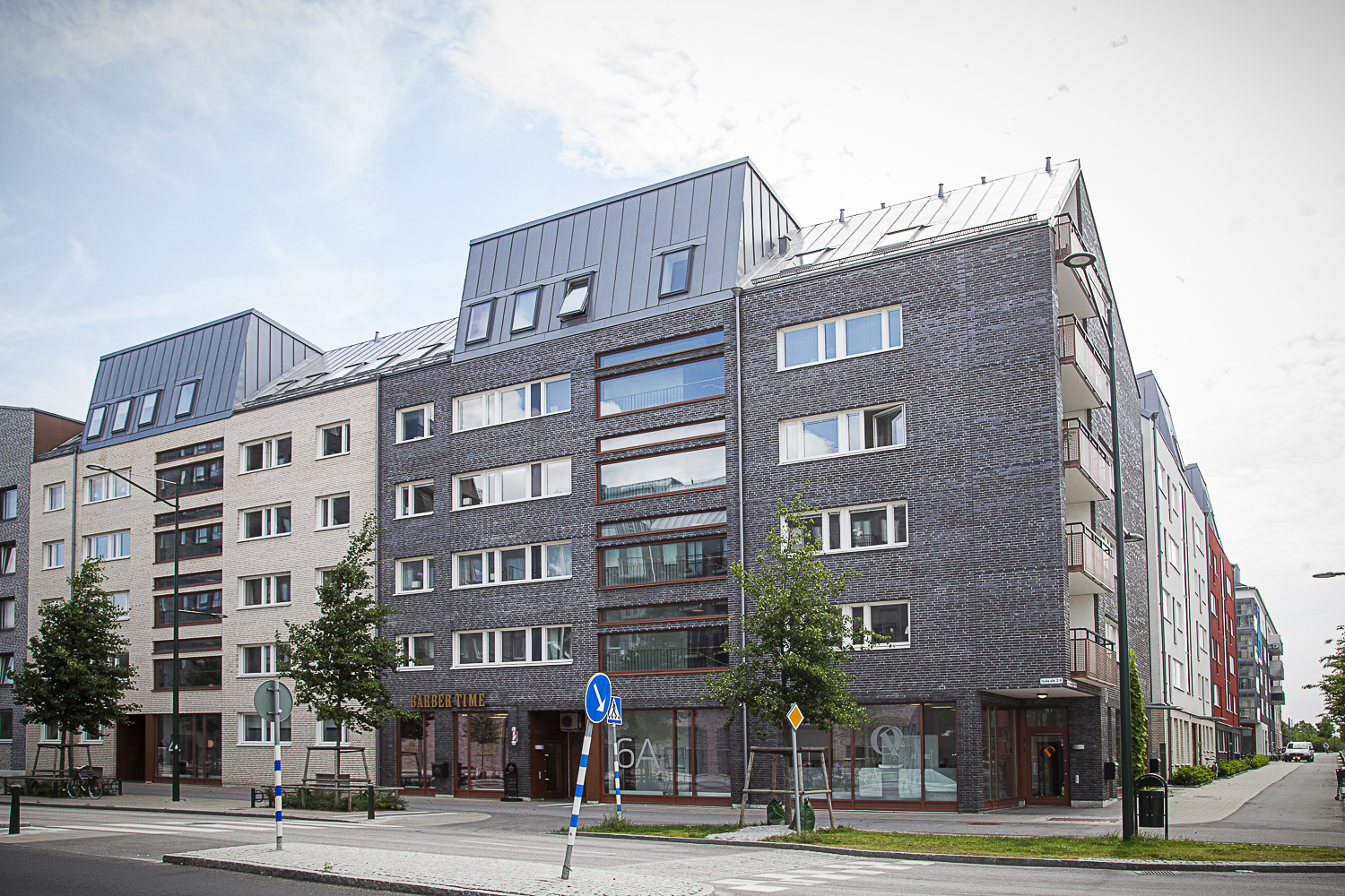 This timeless look in the centre of Täby has a minimalistic and classy look. The building’s squared form and straight lines work fine with bright coloured bricks, that have a slight variation in the final masonry.