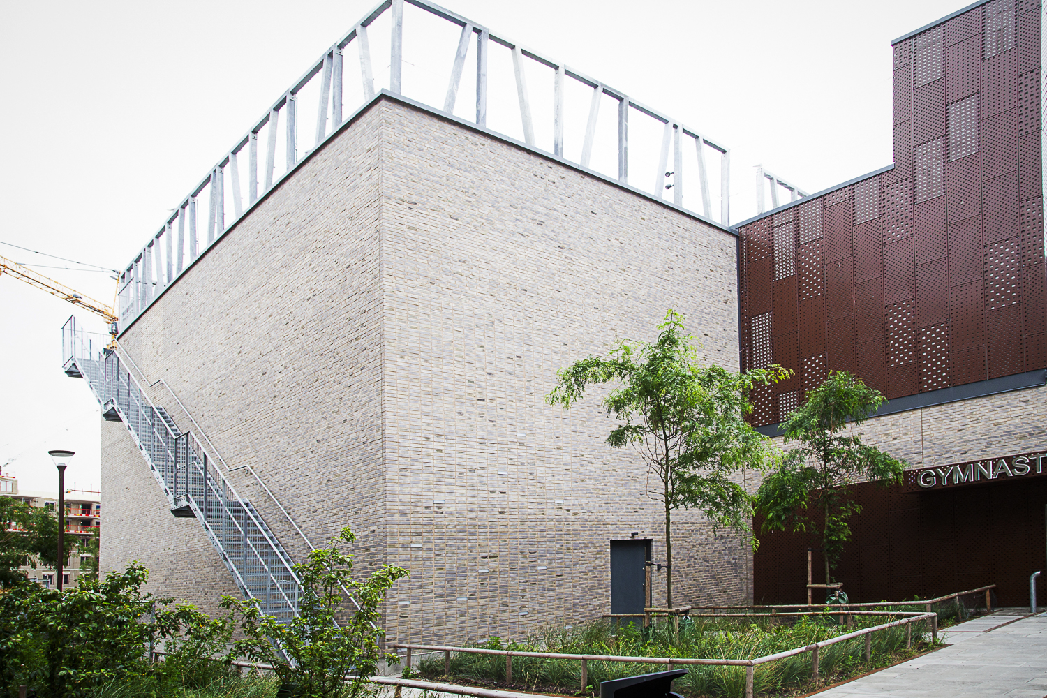 Hanteringen av den stora byggnadsvolymen var utmanande på grund av den lilla tomten och omgivningens småskalighet. För att anpassa skalan mot gatan och de omkringliggande villorna gestaltades byggnaden i flera mindre volymer. Byggnaden präglas av en tydlig ordning och en enkel planlösning. För att få så stora idrottssalar som möjligt saknas korridorer och varje funktion har en egen entré utifrån.