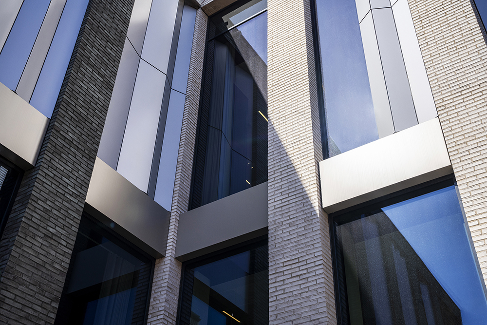 The format is dimensional which adds depth to the overall impression. The bonding is characteristic, while large sections of windows in different formats, vertical and horizontal, unite indoors and outdoors.