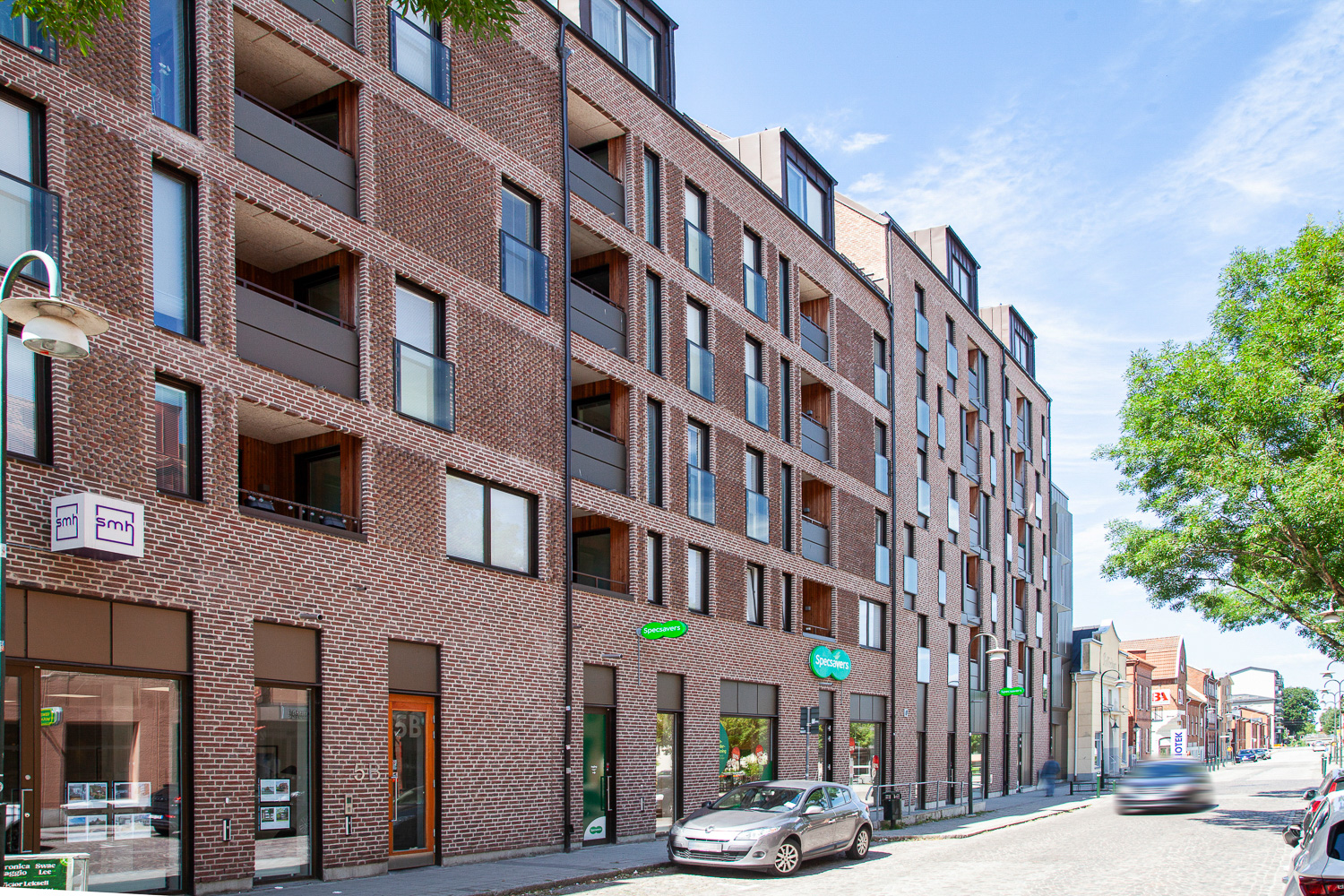 +55 boendelägenheter med fokus på bekvämlighet, avkoppling och säkerhet. Fasaden adderar det lilla extra när kontrasten mellan två färger av exklusivt tegel ramar in detaljer som fönster, balkonger och dörröppningar.