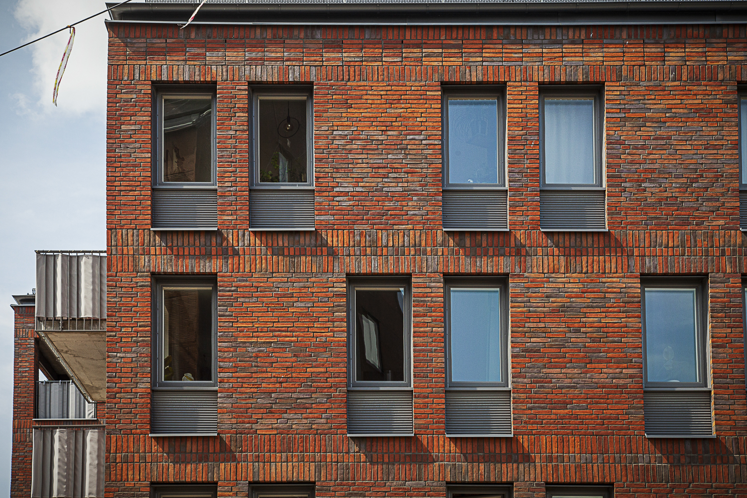 För att kvarteret ska upplevas som sex olika hus, trots samma stomsystem och en gemensam höjdsättning, har man valt att kombinera olika tegelsorter. Något som ger kvarteret en rik och varierad gestaltning.