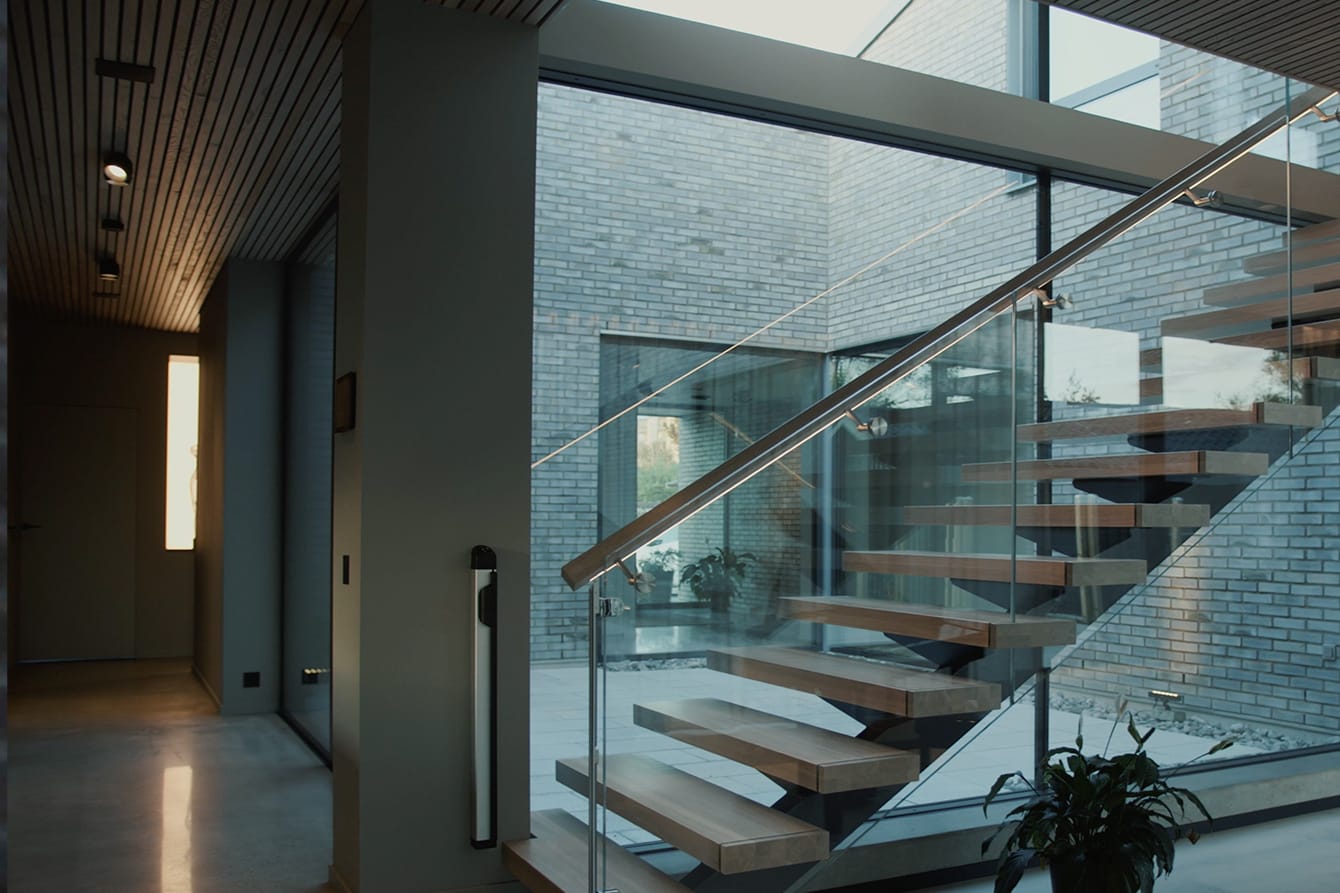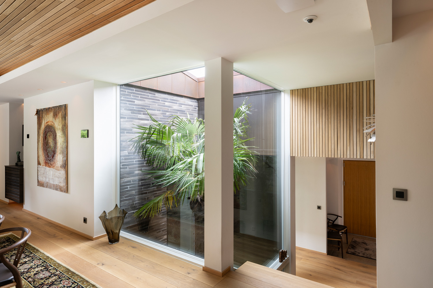 Facadens diskrete åbninger står i skarp kontrast til de store glaspartier, der orienterer sig mod gården og haven, og sikrer både privatliv og en åben forbindelse til naturen. Indskårne gårdhaver og overlejrede etager giver strukturel spænding, mens den ensartede brug af mursten på både gulve og loftet af det åbne tag understreger husets kohærente designfilosofi.