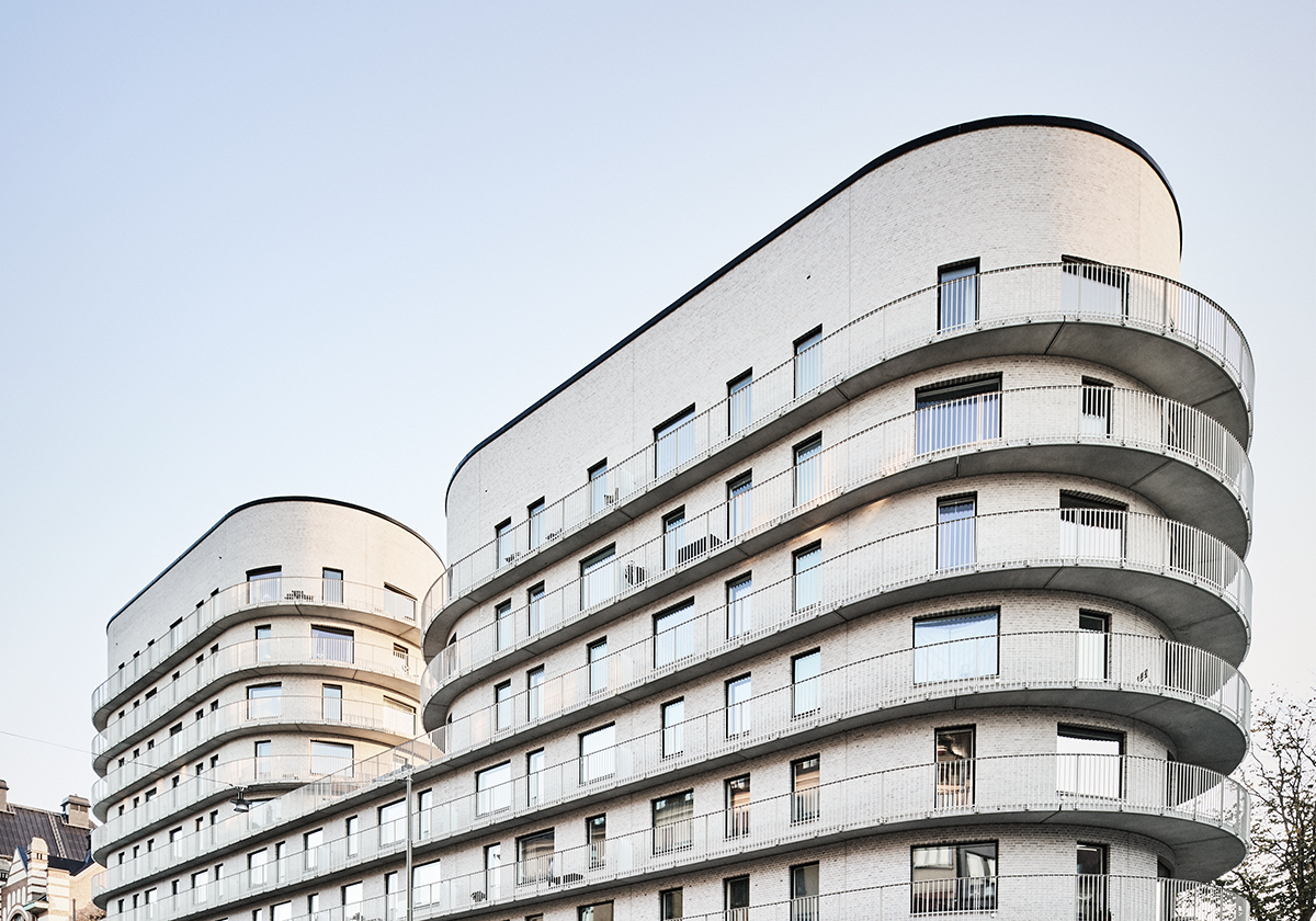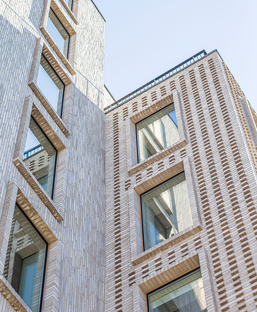Located in the heart of Stockholm. Basaren is a masterpiece of both architecture and engineering, where two oval forms resonate through the entire design and construction of these exclusive city apartments. This building is particular unique because of its façade of transparent masonry, which is made possible by the Carlsberg-system. The devil is in the detail, and this is no exception; each brick used for the transparent part of the brickwork has two extruded holes that matches the shape of the two towered-building. This requires extra structural support in wall elements, lintels and beams – but in turn provides a quiet synergy and gives the building a light and airy feel.