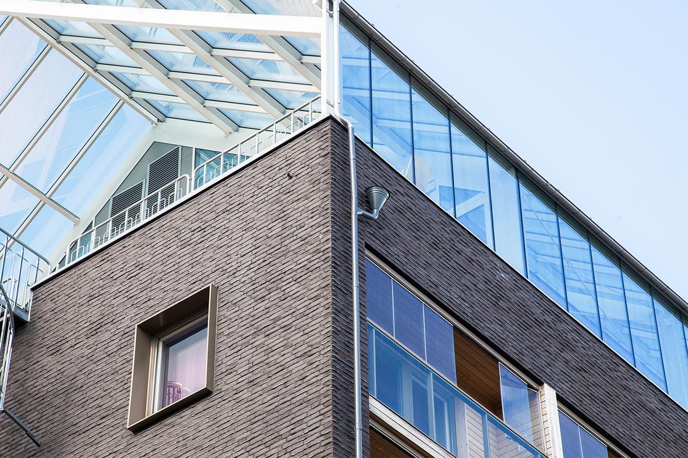 Capitalizing on the Unika brick’s expressive character, these exclusive apartments in Bekkestua, Norway have a special combination of materials. The warmth of the hardwood creates its own unique connection with the coal-burnt variation of bricks. Panoramic roof balconies open up to the light and spectacular views.
