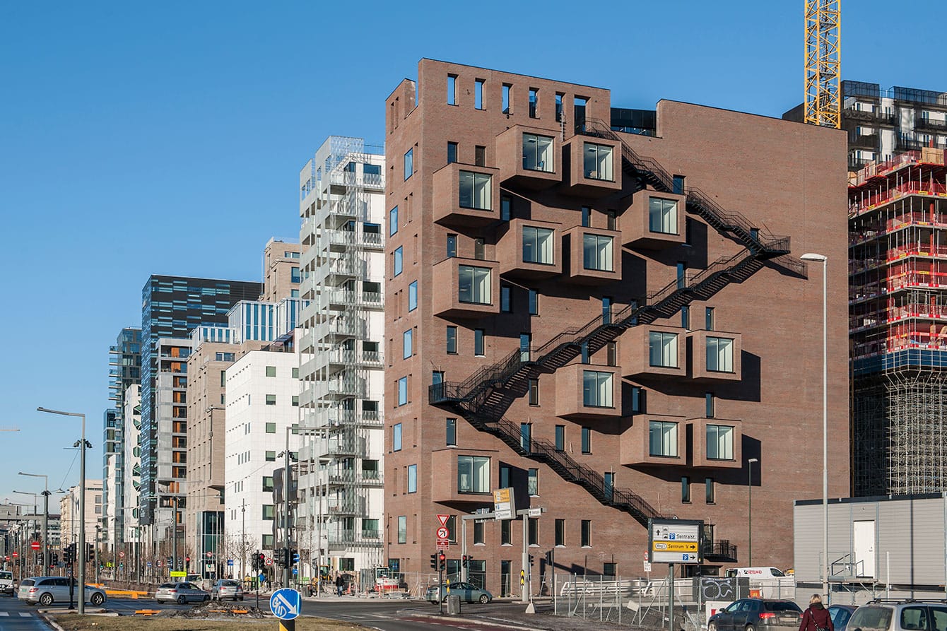 Behold Queen Eufemias Gate 42 (DEG42). An office building at Oslo’s waterfront that stands out with the very strong suspended meeting rooms in tile, which is overhang on the east façade with unique view through floor-to-ceiling windows. Along with New York-inspired fire escape that winds outside on the east, meeting rooms along the façade creates the unconventional a unique sculptural and dramatic look.