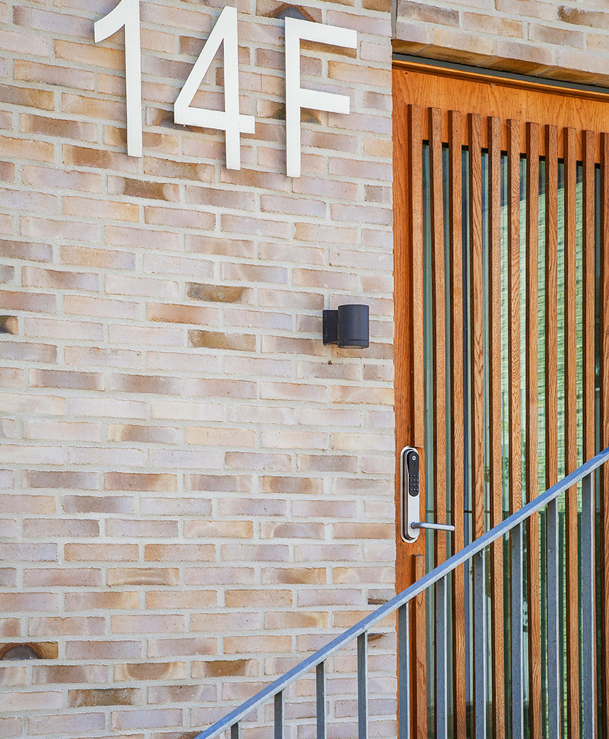 Holmastycket består av två imponerande hus med genomgående entréer. Ett betydande fokus har lagts på omhändertagandet av entréerna för att skapa en välkomnande atmosfär. Här satsade man på högkvalitativt tegel. Det långsmala formatet valdes för att ge boende en upplevelse där varje detalj spelar roll. ”Det har varit viktigt att skapa en känsla av extra omsorg och kvalitet där boende möter sina hem”, säger Per Bondeson, ansvarig arkitekt.