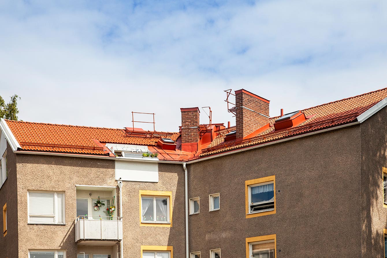 Ett lägenhetshus i olika färger från 1960- och 1970-talet har fått en renovering med röda takpannor.