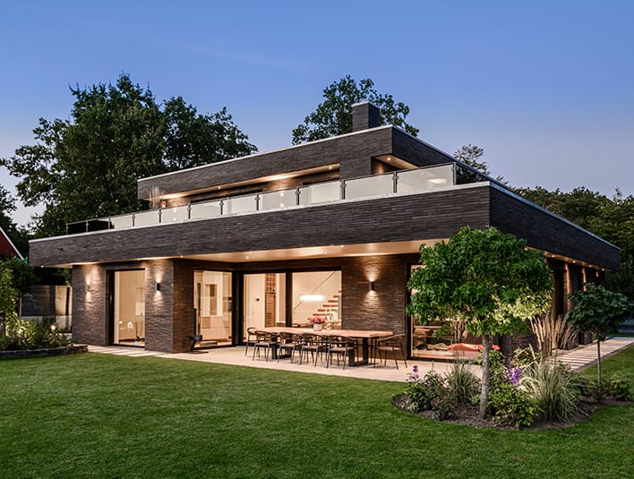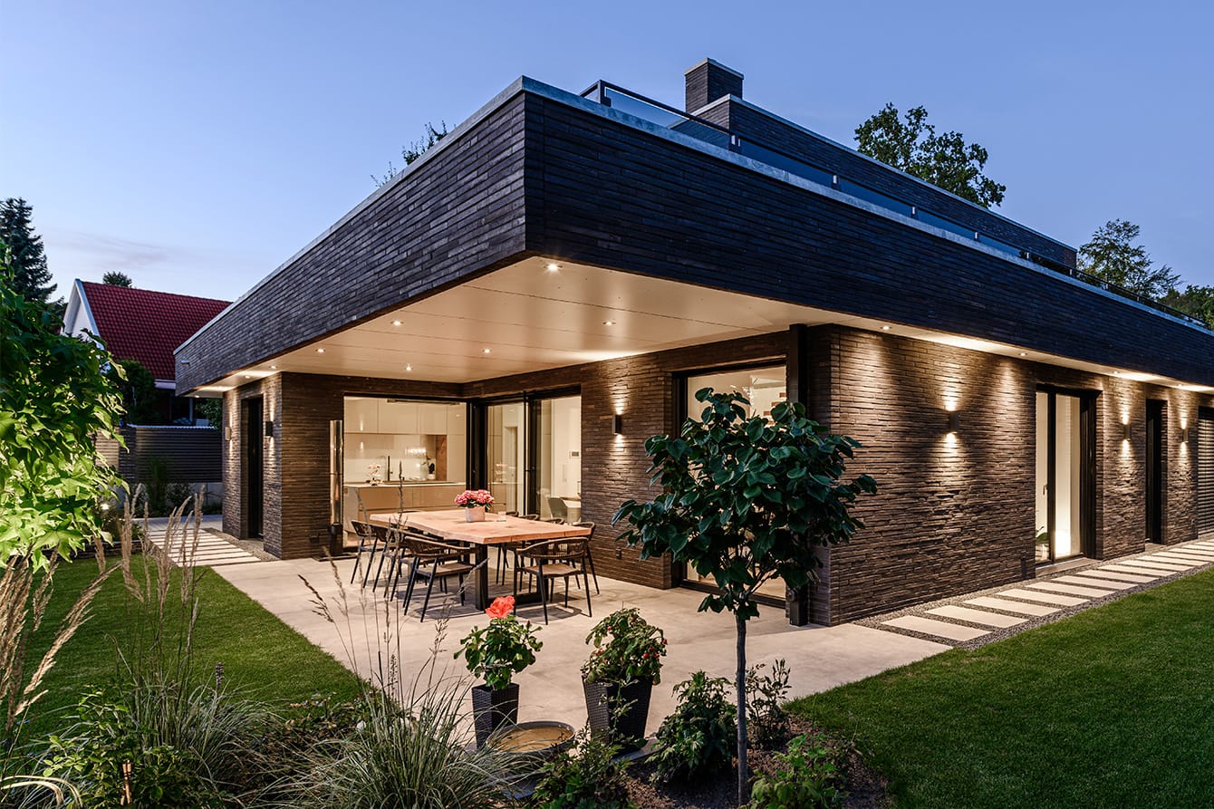 This stunning two-story German villa has fine horizontal lines with comforting overhangs made with dark Ultima-bricks. The floor plan extend the dining and relaxation areas outside sheltered from the element. Upstairs the everlasting summer nights can be enjoyed with a rustic backdrop of soft-moulded long format bricks. Combined with at lush flowering garden this villa has an inviting warm feel to it.