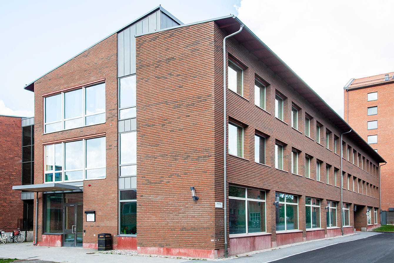 Byggnaden kläs i en yttre fasad av RT 475 Prima Bari. Teglet ges en omsorgsfull detaljering med rullskift och olika djup på luftspalten, som bildar pilastrar och förtydligar vertikalitet. I indrag och slitsar bryts materialbehandlingen till ljusa fibercementskivor. Principen med mörkt mot ljust går igen i bl.a fönster, räckesdetaljer, stuprännor och krönplåtar.