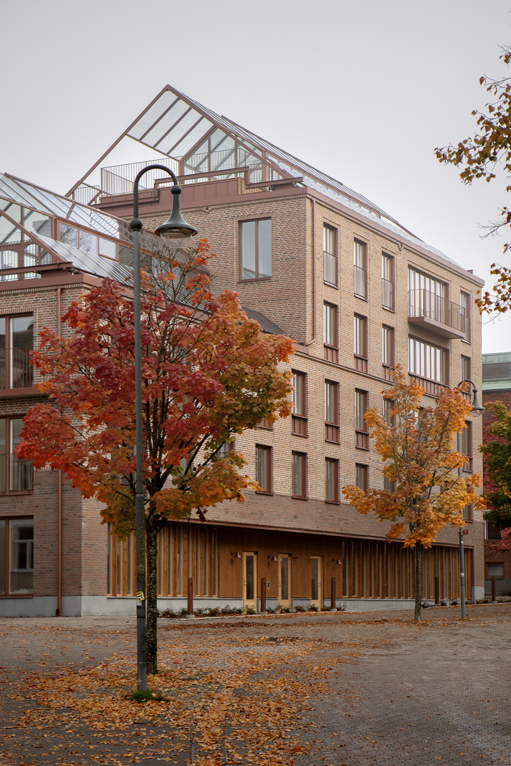 Förutsättningarna för projektet var en väldigt långsmal och utmanande tomt. Av den anledningen har byggnaden delats upp i fem huvudvolymer. Tre helt i tegel och två mellanliggande volymer i skärmtegel. Skärmteglet är återkommande i tegelvolymernas fönsterband.